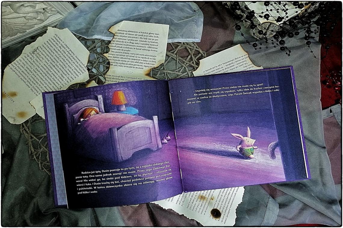 Dusia uwielbia, gdy to tata czyta jej bajki na dobranoc. Zwykłą krótką historię zamienia w niesamowitą opowieść, która działa na bezbrzeżną wyobraźnie małej dziewczynki i jej pluszowego towarzysza. Gdy w świat książek zabiera ich mama, nie jest tak zabawnie, brakuje bowiem pokazywania tego, o czym się czyta w danym momencie. Gdy tata rozpoczyna wieczorne czytanie, Dusia prosi go, o jedną z tych strasznych historii zapewniając, że nie będzie się bać. Tak powstaje niegrzeczny potwór, który wyjada z lodówki i zostawia odkręconą pastę do zębów, strasznie przy tym hałasując. Dziewczynka po nieprzespanej nocy wyrusza do przedszkola i tam o zgrozo wiele się dzieje. Nowa pani z dziwnym bąblem na twarzy i te czerwone kanapki z pastą, której nigdy nie próbowali. Jak poradzą sobie ze strachami małymi i dużymi? Czy potwór też się czegoś boi?