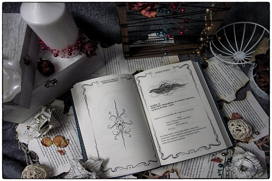 Ale od początku. Fantastyczne zwierzęta. Zbrodnie Grindelwalda to przede wszystkim historia spisana w formie scenariusza filmowego, zawierająca przypisy skierowane do autorów i opisy tworzone na potrzeby kreacji konkretnych scen. Całość oprawiona w twardą obwolutę zachwyca jakością, kolorem i tłoczeniami. Środek, a właściwie zdobienia każdej strony dają sporo radości osobą lubującym się w tak eleganckich i pięknych wydaniach. To jednak mało znaczące fakty, gdyż liczy się fabuła, a ta znacząco różni się jakością od pierwszego tomu Fantastycznych zwierząt.