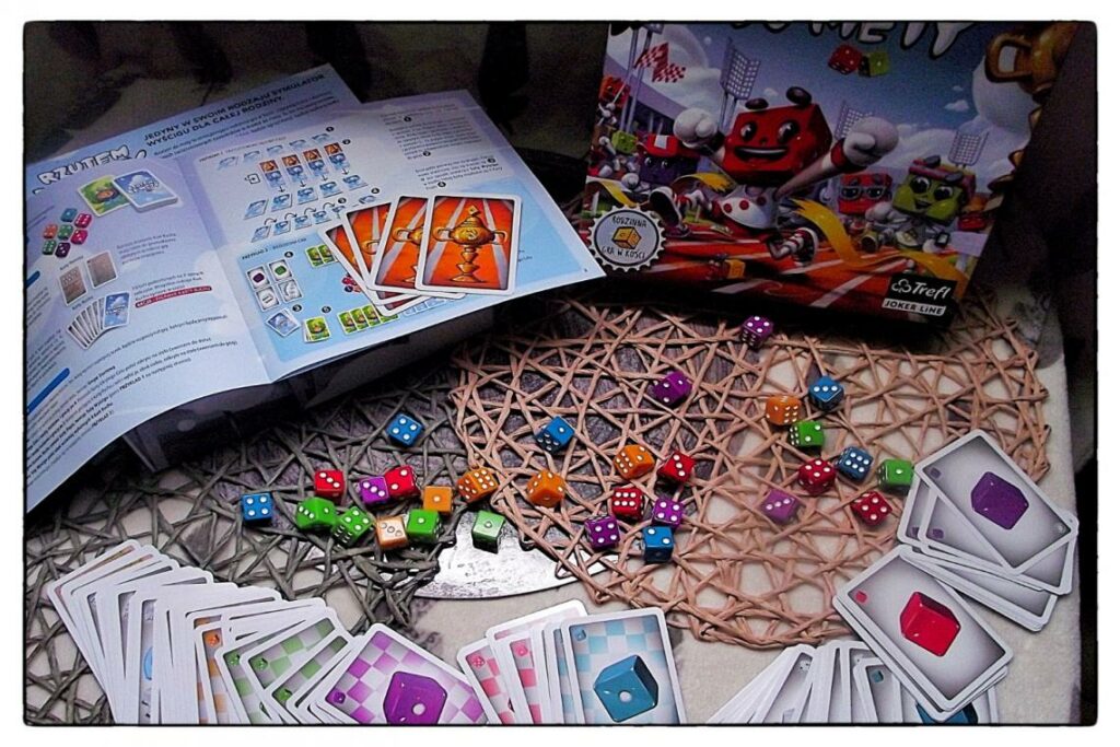 Gra jest niezwykle barwna, co przyciągnie wzrok dziecka i pozwoli na rozwój przez zabawę. Całość składa się z 30 kostek, 70 kart rzutu, 30 kart ukrytego celu, 4 kart etapu, 6 kart pomocy i skróconej instrukcji, która przeprowadzi was przez pierwszą rozgrywkę. Wszystko jest trwałe i przyjemne dla oka. Rozgrywka jest nie przewidywalna, możecie spędzić przy niej długie letnie wieczory, bądź przygotować się na jesienną szarugę, którą pokonają kolorowe kostki i równie barwne karty.