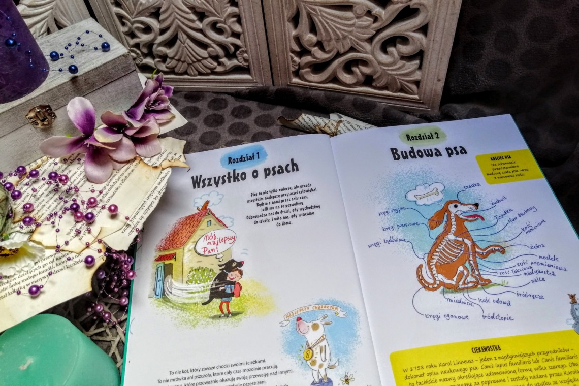 Mogłabym napisać jednym słowem, że wszystkiego, ale to byłoby za proste. Zacznijmy więc od podstaw. Wystarczy otworzyć książkę, by dowiedzieć się, jak zbudowani są nasi pupile. Później jest już tylko barwniej. Pochodzenie psa, ilość ras i to, czym się różnią to nie wszystko, gdyż książka zawiera wiele ciekawostek dotyczących psów. Czy pies był pierwszym udomowionym zwierzęciem? Czy może jeść kości? A tak właściwie co robi pies, gdy nas nie ma w domu? Możliwe, że odpowiedzi na te pytania poznacie, gdy nauczycie się psiego alfabetu. Jedno jest pewne, nie będziecie żałować.